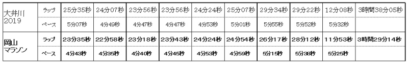 | スタート地点の道路は道幅も広くストレスなく走れる。「接地をていねいに」「推進力を生む重心移動」を意識して走る。2キロほど走った最初の橋の上り坂で有森さんに追いつく。「まだ足使っちゃだめだよ」と大声で周りに檄を飛ばしていました。 桃太郎通り、岡山駅前を走り抜ける。応援は途切れない。7キロから18キロの折り返しまでほぼ直線。1キロ表示ごとにマラソン川柳が表示されており、「マラソンあるある」で元気がでる。 20キロすぎから日差しの厳しさが気になりだした。給水では一口飲んで残りを頭からかける。給食はきびだんご1個とっただけ。持参した塩アメとショッツ投入。 30キロまでキロ5をキープできた。30キロを2時間22分57秒。キロ4分46秒ペースで2週間前のしまだ大井川より4分7秒速い。前半、貯金し後半粘りサブ3.5でゴールする作戦どおりだ。 0− 5 23:35(4:43/km)【大井川10/27 25:35(5:07/km】 5−10 22:58(4:35)【24:07(4:49)】 10−15 23:18(4:40)【23:56(4:47)】 15−20 23:43(4:45)【23:56(4:47)】 20−25 24:24(4:53)【24:24(4:53)】 25−30 24:54(4:59)【25:07(5:01)】 0−30 2時間22分52秒(4:46)【2:27:05(4:54)】−4分7秒 |